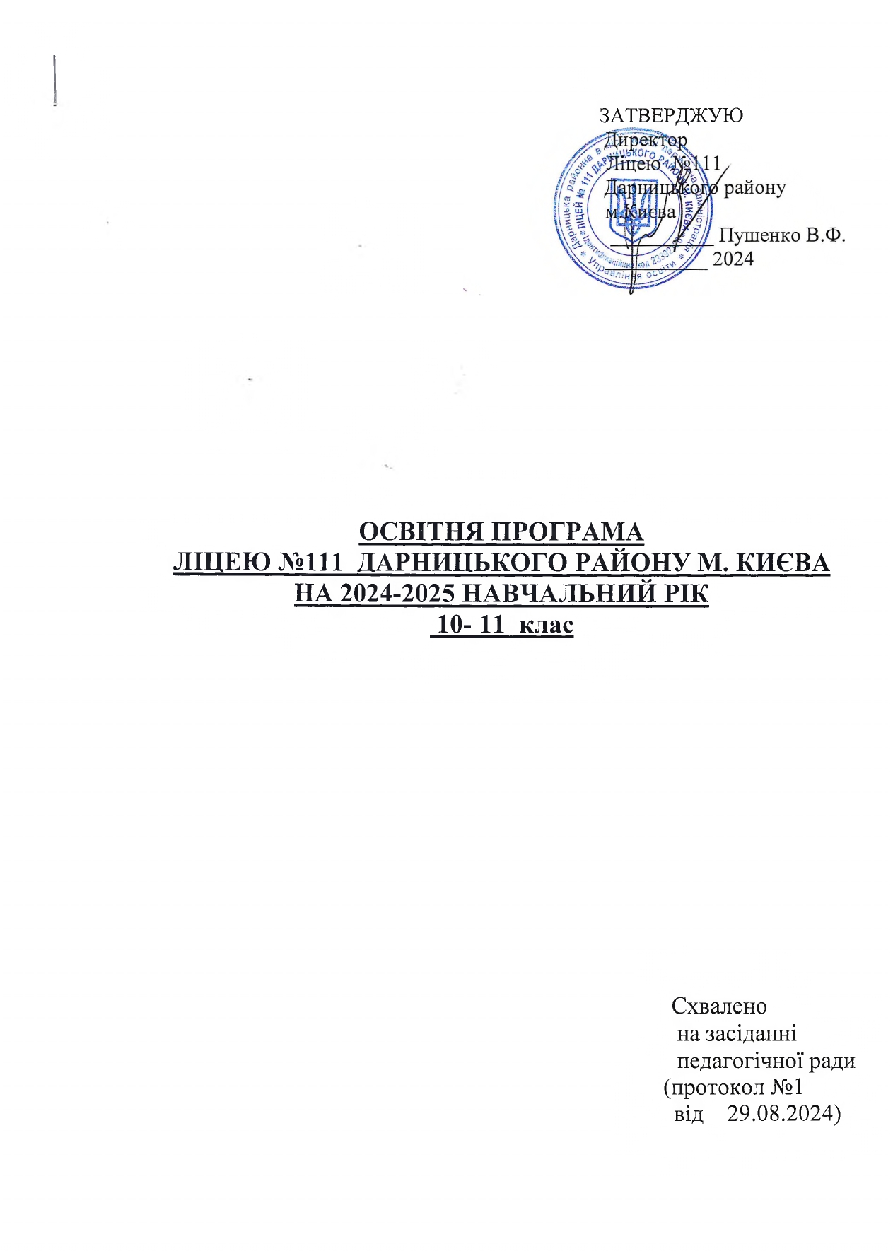 | 11. | Математика (алгебра і початки аналізу та геометрія) (10-А,11-А клас) | Рівень стандарту | Затверджено Міністерством освіти і науки України» наказ МОН від 23.10.2017 № 1407 |